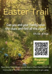 A fun Easter trail. Can you and your family solve all the clues and find all the eggs? You can take part anytime between 3/4/26 - 8/4/26. Bring your completed form to Chard Baptist Church on the 8th April to get a prize.